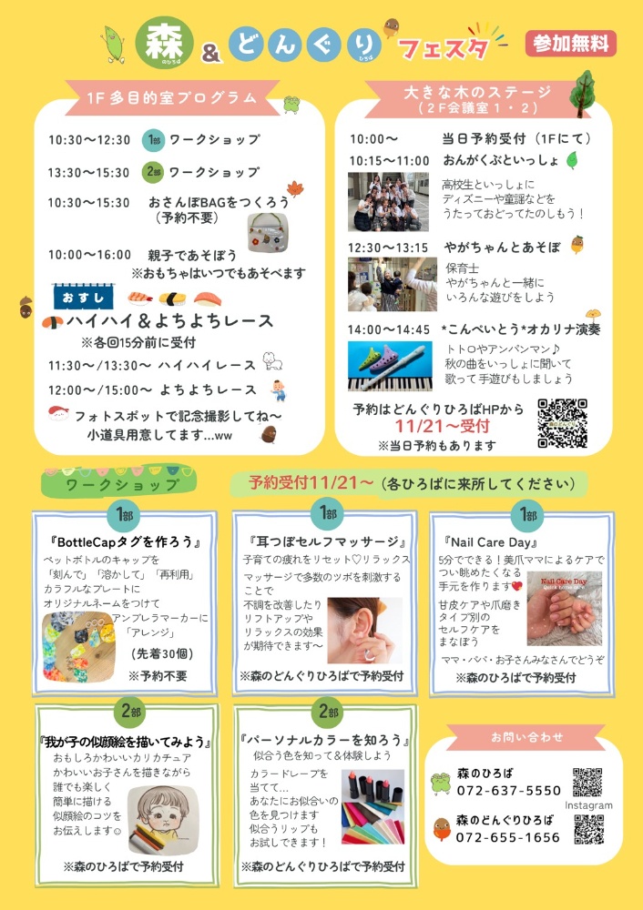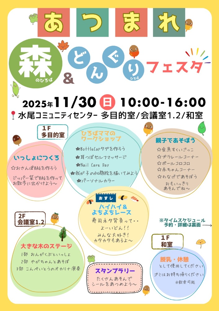 もうひろばでチラシをご覧になりましたか?『あつまれ森のひろば& どんぐりひろばフェスタ』を2025年11月30日(日) 10:00〜水尾コミュニティセンター で開催します!『森のひろば』と『森のどんぐりひろば』の合同開催です。いつものひろばあそびからワークショップやステージまで親子の「たのしいな♪」が見つかりますように!!詳しくはひろばで配布中のチラシやホームページでチェックしてくださいね。