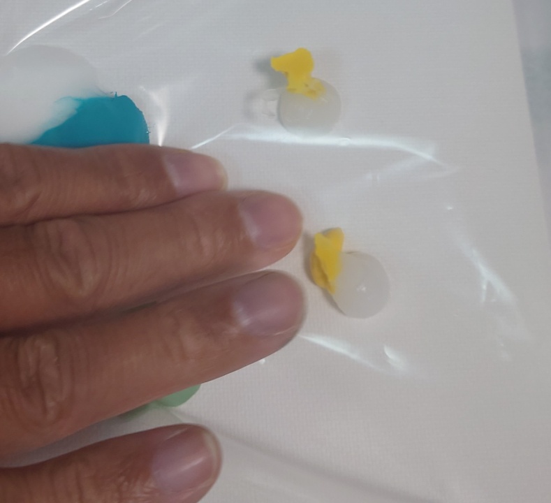 好きな色をのせたキャンバス袋の中に入れてプニプニしよう!終わったらビニールの中には親子共同作品ができあがっています!どんなアート作品になるかな?